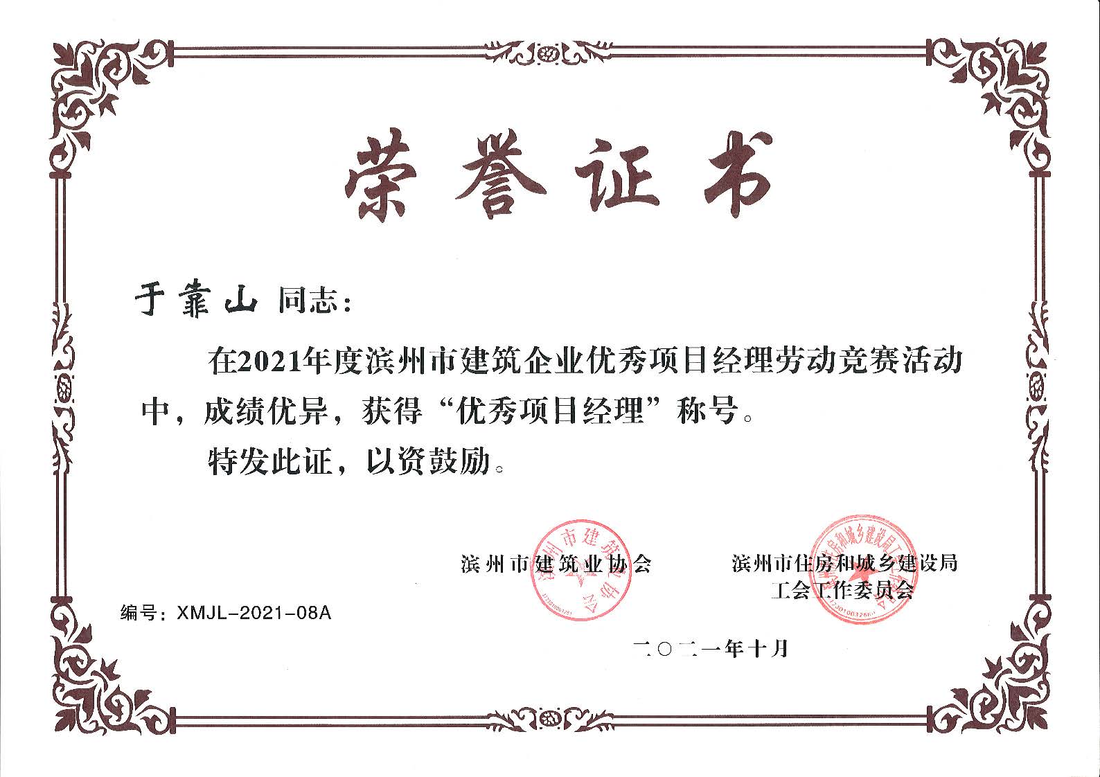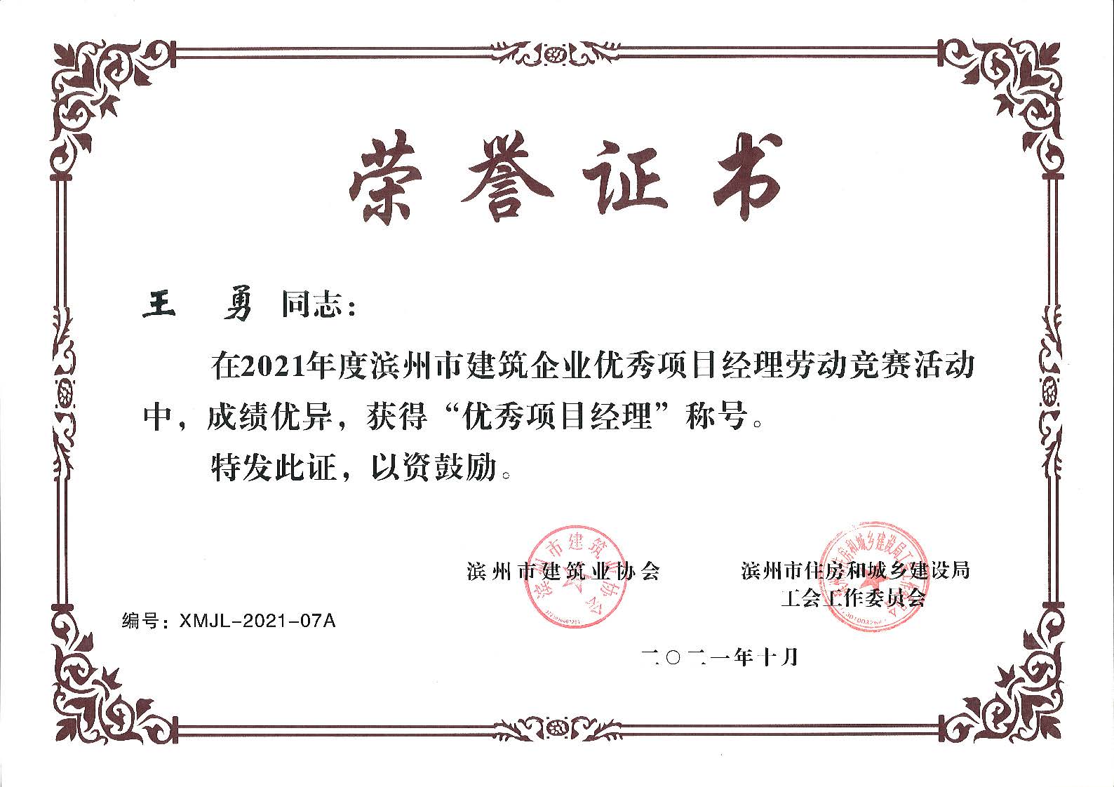 在濱州市住建局工會工委和濱州市建筑業(yè)協(xié)會組織的2021年度濱州市建筑企業(yè)優(yōu)秀項目經(jīng)理勞動競賽活動中,經(jīng)公司推薦、競賽工作委員會評議審定和綜合評審、網(wǎng)上公示等工作程序,我公司三名同志(王勇同志、房磊同志、于靠山同志)獲評“優(yōu)秀項目經(jīng)理”稱號。