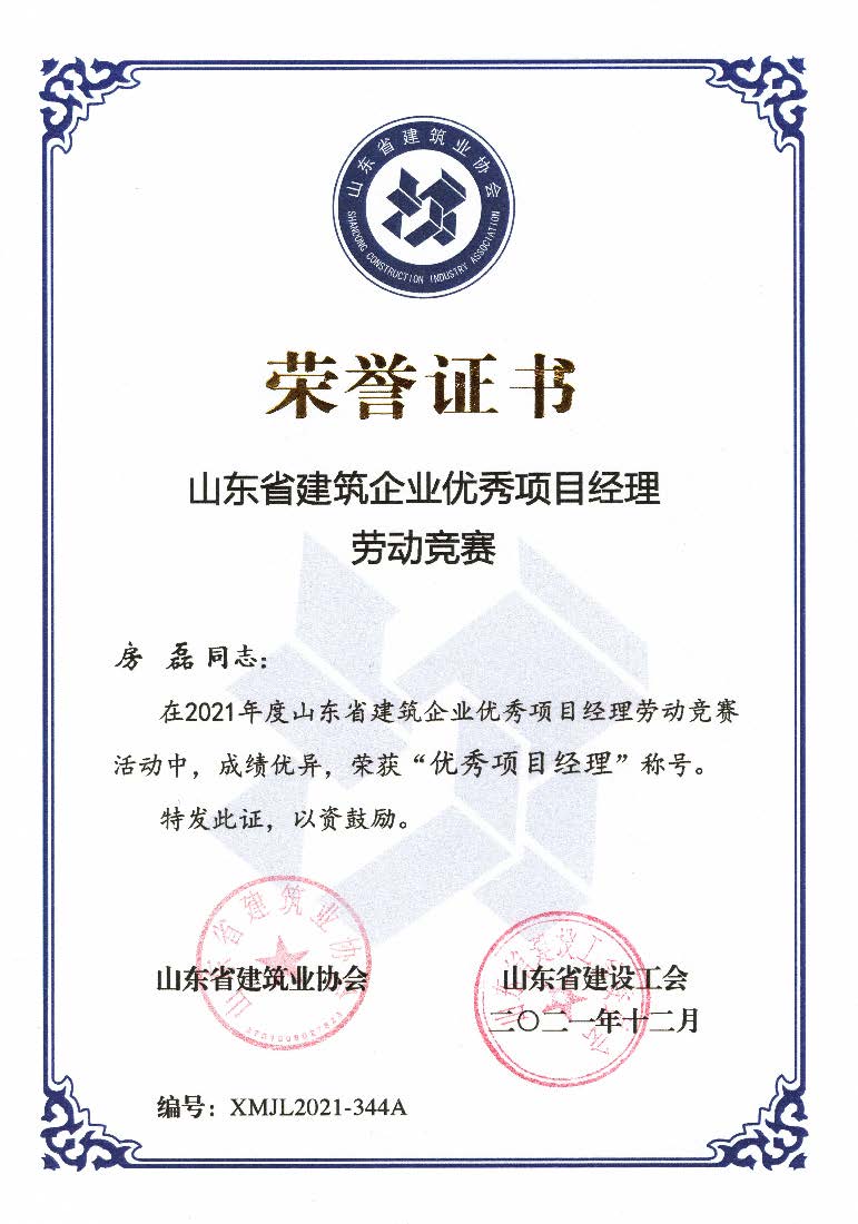 在山東省建筑業(yè)協(xié)會和山東省建設(shè)工會組織的2021年度山東省建筑企業(yè)優(yōu)秀項(xiàng)目經(jīng)理勞動競賽活動中,我公司王勇同志和房磊同志獲評山東省建筑企業(yè)“優(yōu)秀項(xiàng)目經(jīng)理”稱號。